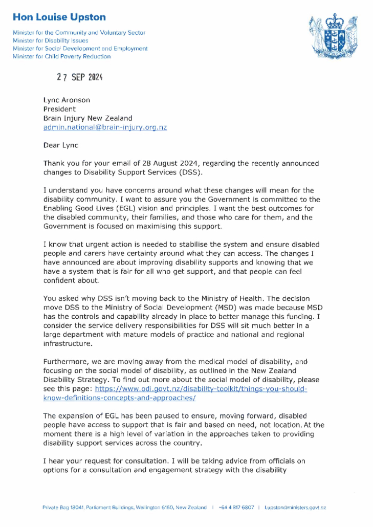 You are here: Home1 / News2 / Brain Injury New Zealand Advocates for Consultation and Transparency in Whaikaha Changes and EGL Pause3 / Letter to Lync Aronson